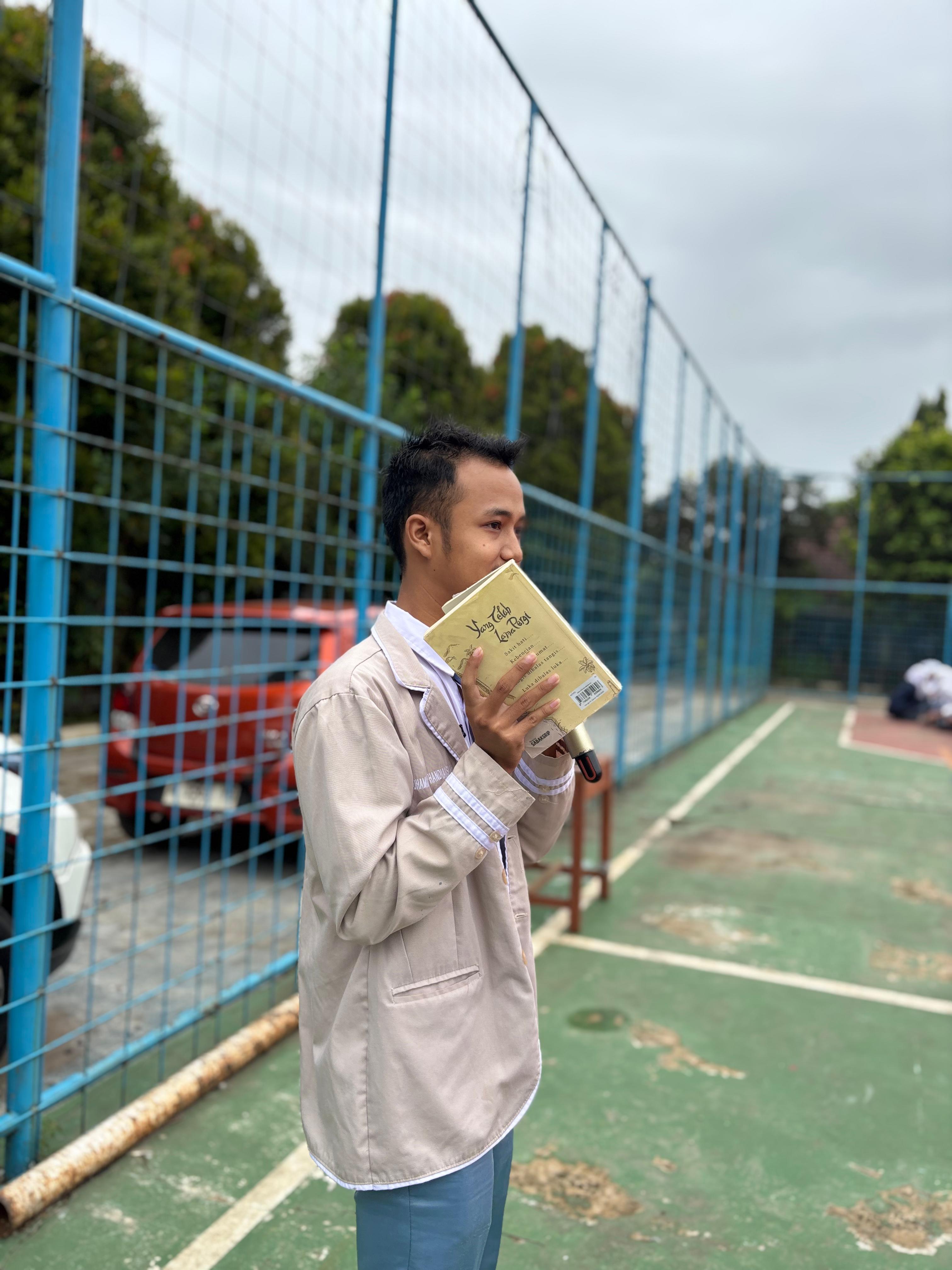 Keterangan Gambar : M. Handiyansyah, siswa kelas XI.D yang saat ini juga menjabat sebagai wakil ketua OSIS, menyampaikan hasil literasinya di hadapan siswa sebelum pelaksanaan duha bersama. (27/1/2026)