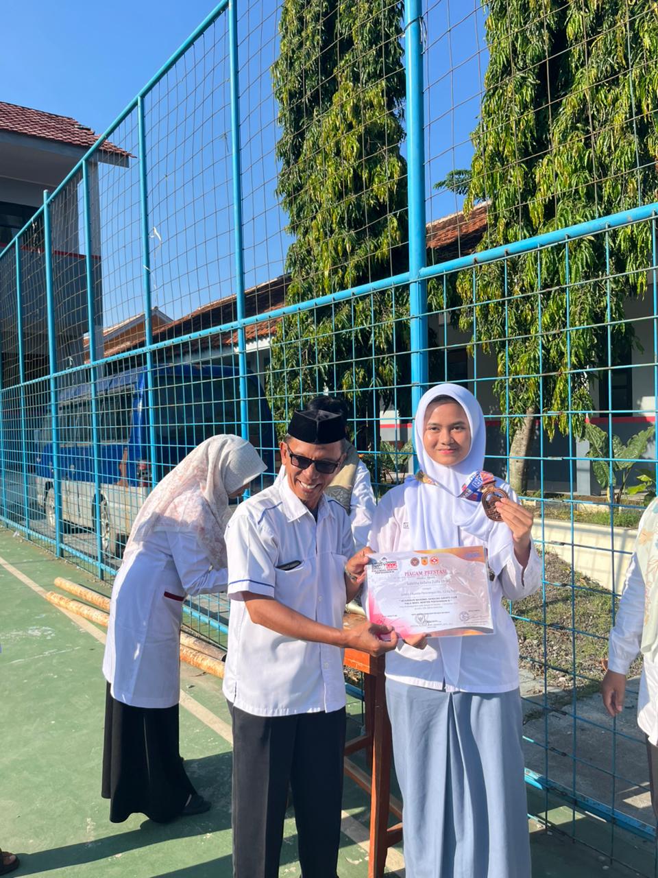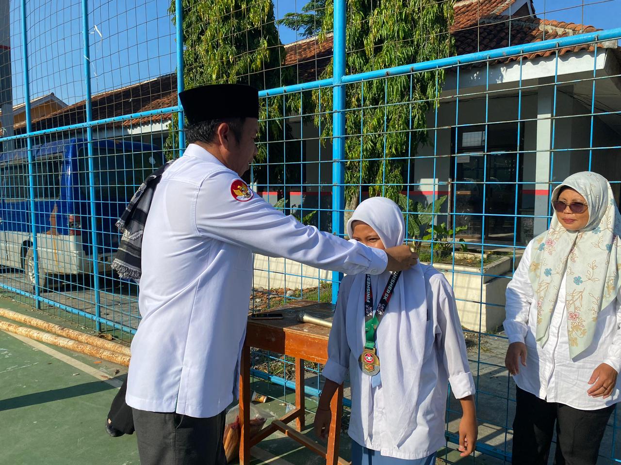 Keterangan Gambar : Kepala MAN 5 Bogor Memberikan Apresiasi Kepada Salah Satu Atlet Karate Berprestasi Tingkat Nasional Usai Duha di Lapangan Madrasah. (04/11/2025)