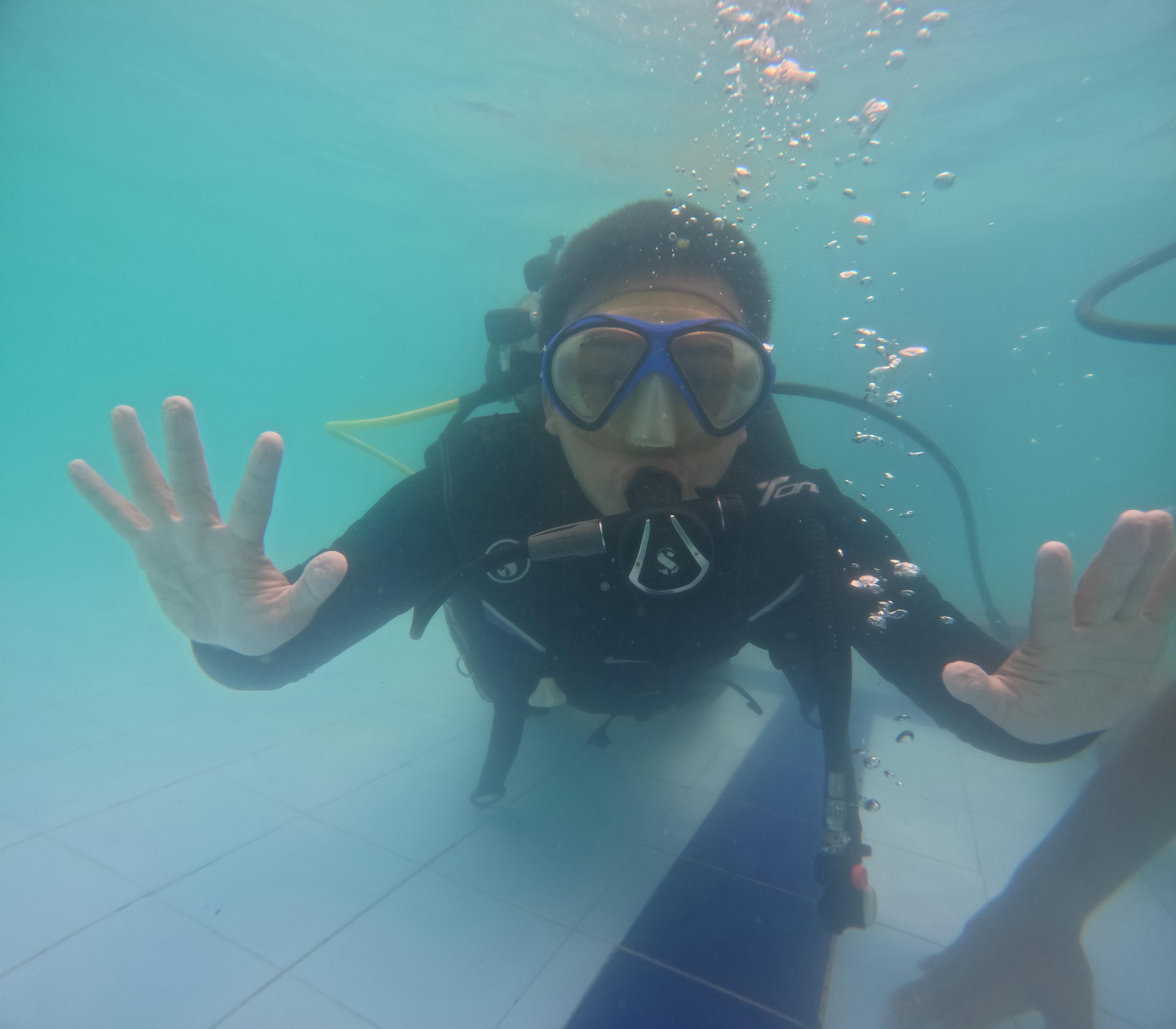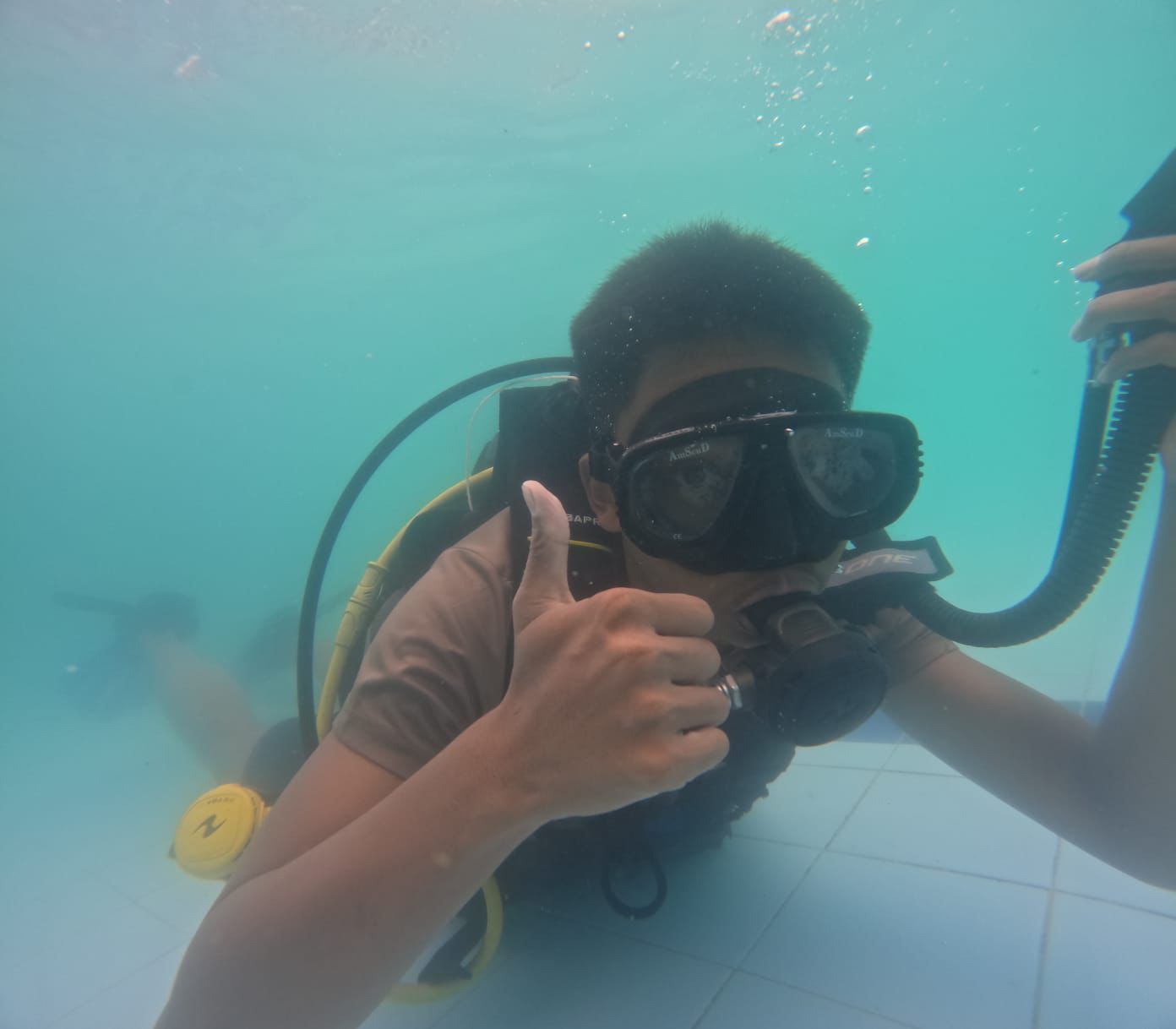 Selanjutnya, peserta mengikuti sesi latihan perairan tertutup di kolam renang. Dalam sesi ini, peserta mempraktikkan berbagai keterampilan dasar, di antaranya teknik pernapasan menggunakan regulator, mask clearing, regulator recovery, kontrol daya apung (buoyancy), serta teknik masuk ke air seperti giant step entry dan back roll entry.