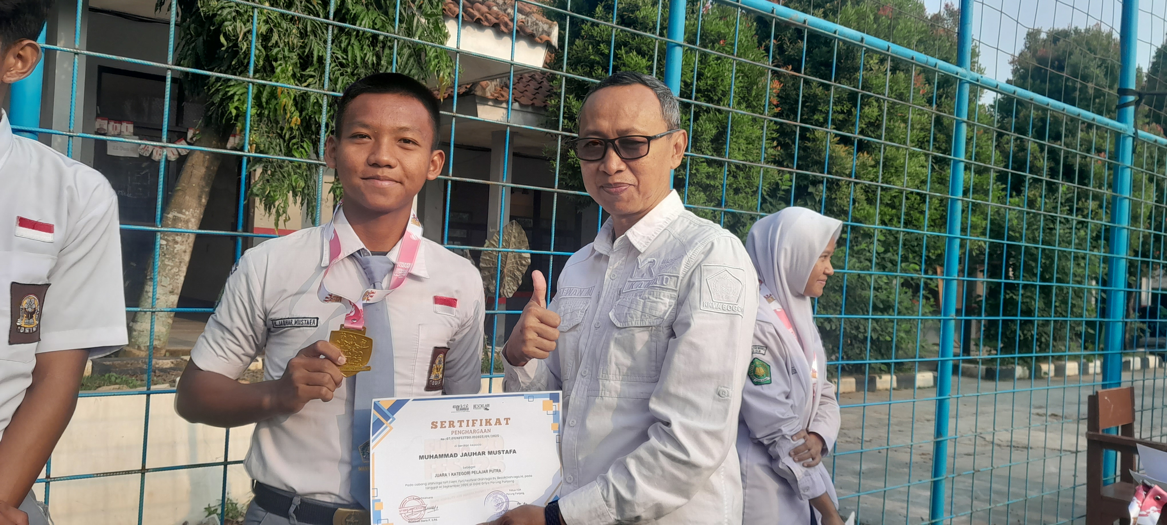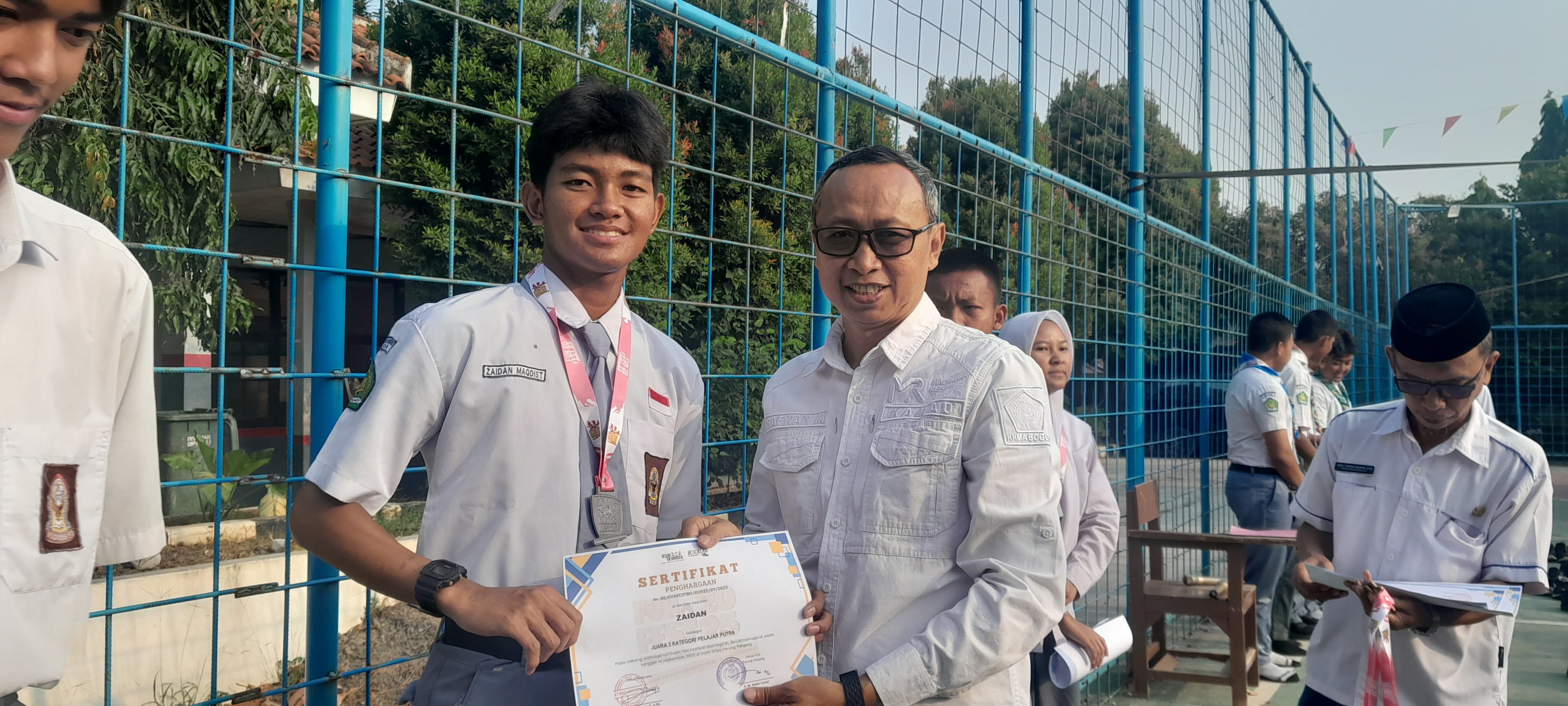 Keterangan Gambar : Kepala MAN 5 Bogor, bapak Safwan Maulana Menyematkan Medali dan Menyerahkan Sertifikat Kejuaraan Atletik Kepada 5 (Orang Siswa) Usai Duha Bersama di Lapangan Madrasah